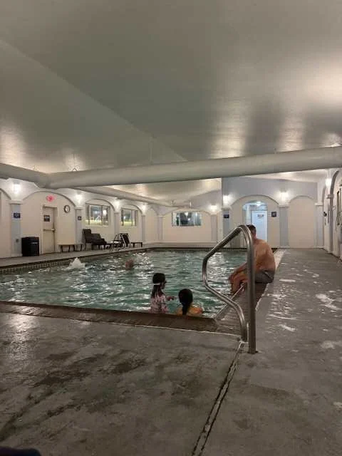 The indoor pool was completely empty when we arrived, and a warm respite from the chilly day on the beach. Our kids splashed and played in the shallow end while we swam a few laps.