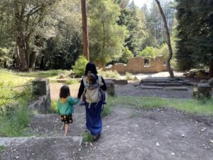The hike is an easy 0.2 miles round trip, so let your kiddos walk and take their time meandering through a beautiful redwood grove and climbing on the ruins.