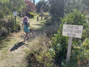 There are picnic tables under vine-covered gazebos, kid-sized houses to play in, and a sculpture garden full of fun things to see. We wandered through the sculpture trail and found spiders, mermaids, fish, faces, kites, and so much more.