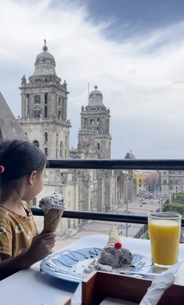 As the name suggests, the trendy Terraza Cha Cha Cha has patio seating on two sides of its fifth floor restaurant with a view of the Monument to the Revolution. Service is awesome and the food comes out quickly in this airy and modern-styled space. This was where our kid tried chapulines (fried crickets) for the first time, and they were a hit! They also have changing tables in the bathroom—score!