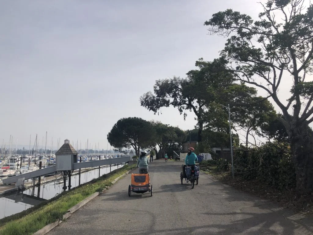 Ferla family cargo bike riding in Alameda Point, Alameda CA